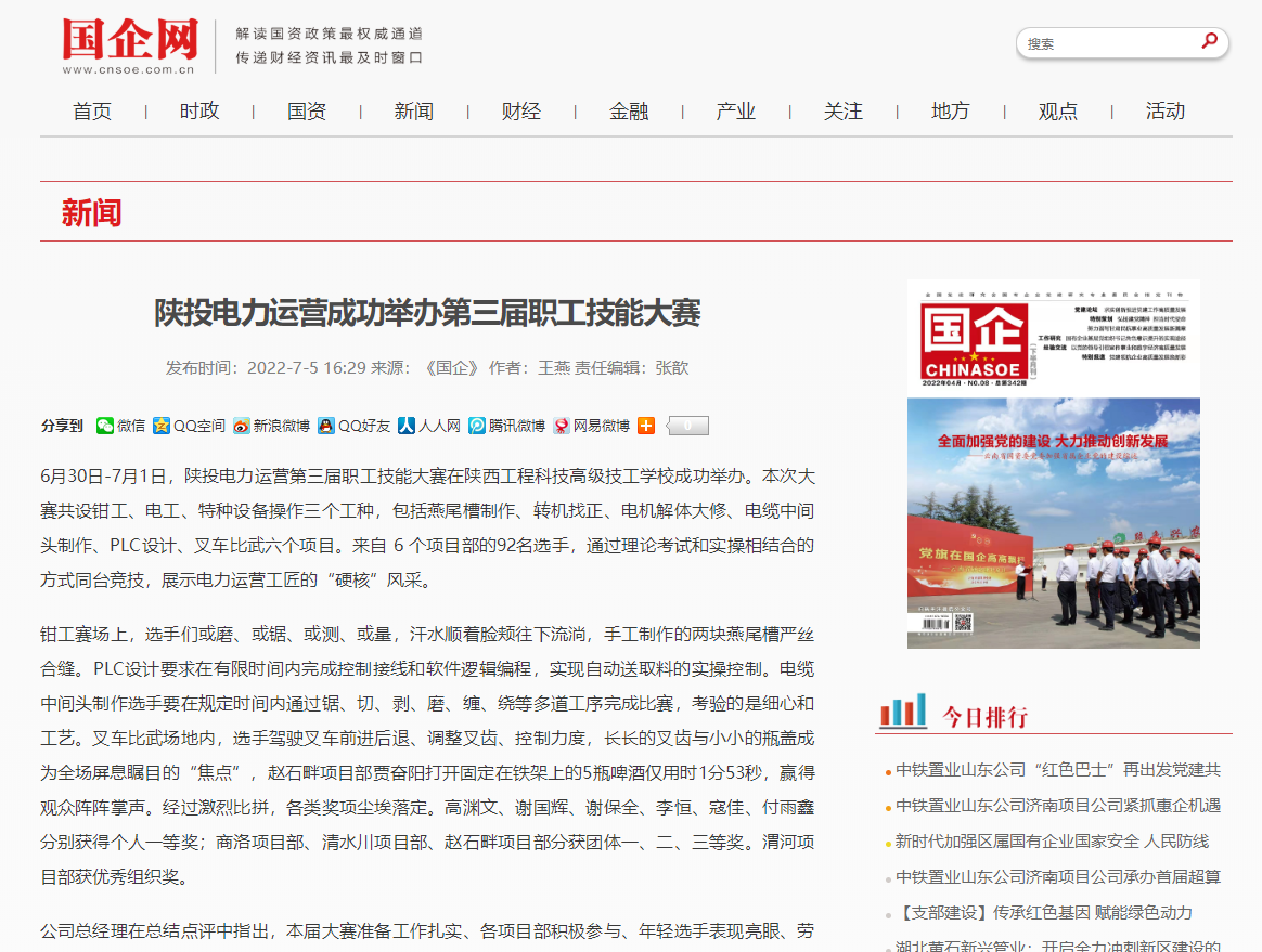 6月30日——7月1日,公司第三屆職工技能大賽在陜西工程科技高級(jí)技工學(xué)校成功舉辦。集團(tuán)經(jīng)營(yíng)管理部主任梁軍軍參加閉幕式并為獲獎(jiǎng)選手頒獎(jiǎng)。陜能股份總經(jīng)濟(jì)師楊玉林、生產(chǎn)技術(shù)部主任王軍泓出席開幕式。