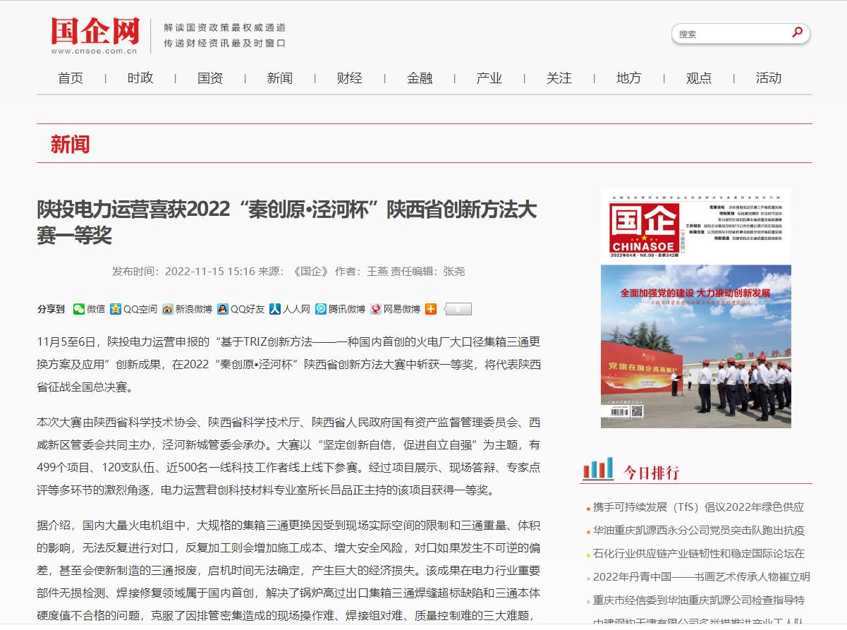 11月5至6日,由陜西省科學技術協(xié)會、陜西省科學技術廳、陜西省人民政府國有資產(chǎn)監(jiān)督管理委員會、西咸新區(qū)管委會共同主辦,涇河新城管委會承辦的“秦創(chuàng)原?涇河杯”2022年陜西省創(chuàng)新方法大賽決賽在涇河新城產(chǎn)業(yè)園成功舉辦。君創(chuàng)科技材料專業(yè)室所長呂品正“基于 TRIZ 創(chuàng)新方法-一種國內(nèi)首創(chuàng)的火電廠大口徑集箱三通更換方案及應用”的創(chuàng)新成果從全省499個項目中脫穎而出,以第13名的好成績斬獲一等獎,將代表陜西征戰(zhàn)全國總決賽。