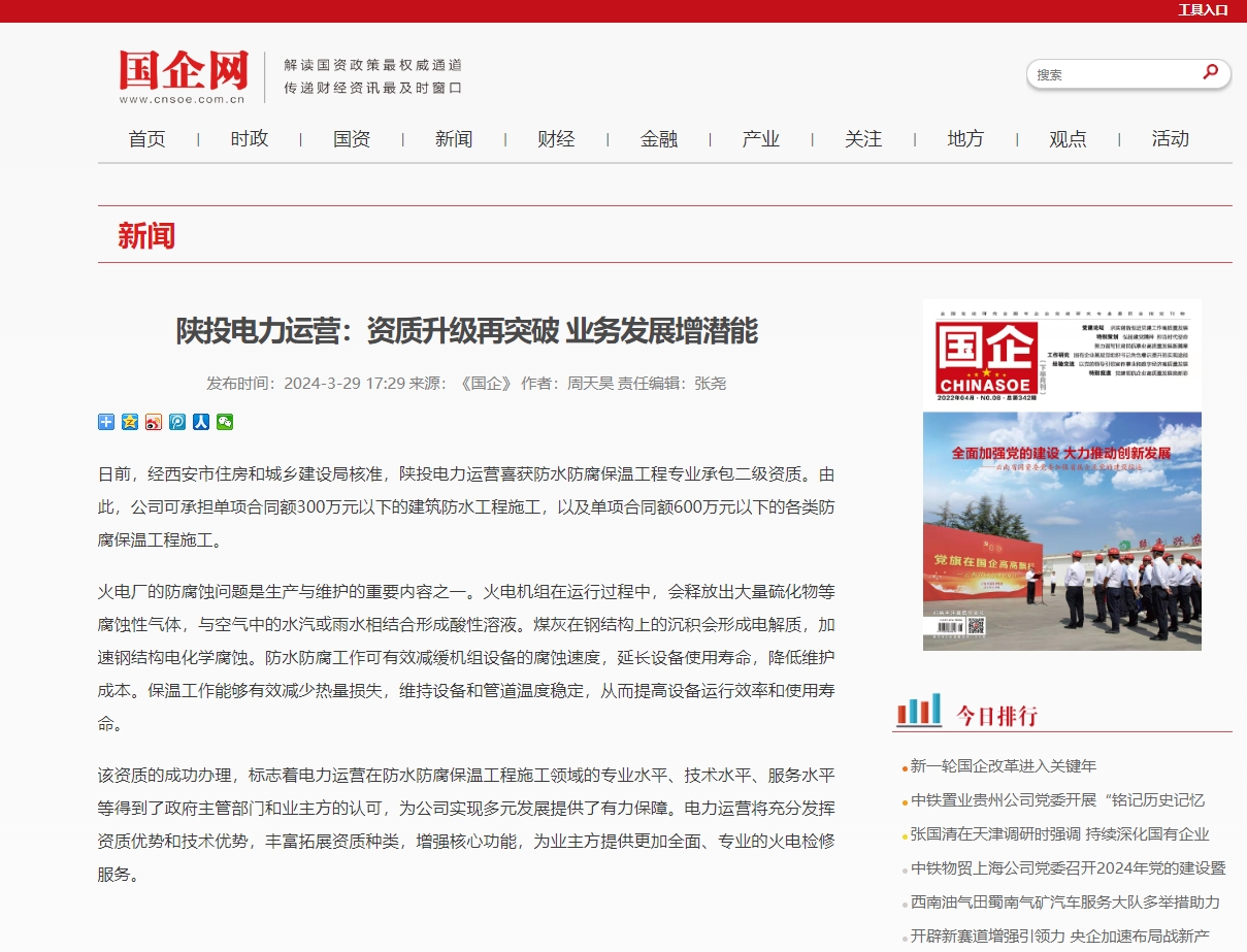 該資質(zhì)的成功辦理,標(biāo)志著電力運(yùn)營(yíng)在防水防腐保溫工程施工領(lǐng)域的專業(yè)水平、技術(shù)水平、服務(wù)水平等得到了政府主管部門和業(yè)主方的認(rèn)可,為公司實(shí)現(xiàn)多元發(fā)展提供了有力保障。電力運(yùn)營(yíng)將充分發(fā)揮資質(zhì)優(yōu)勢(shì)和技術(shù)優(yōu)勢(shì),豐富拓展資質(zhì)種類,增強(qiáng)核心功能,為業(yè)主方提供更加全面、專業(yè)的火電檢修服務(wù)。